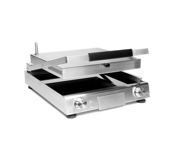 Maxi sandwich heater with smooth ceramic glass base and ridged cover with drainer and thermostatic control