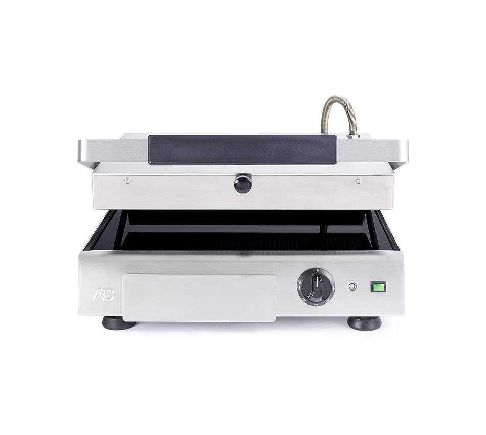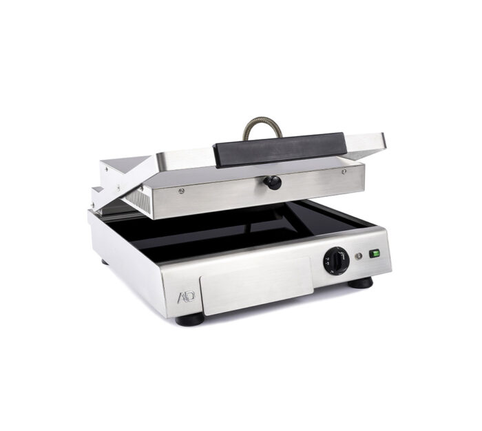 Sandwich heater with smooth ceramic glass base and ridged cover with drainer and thermostatic control